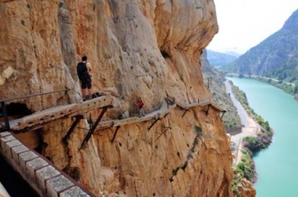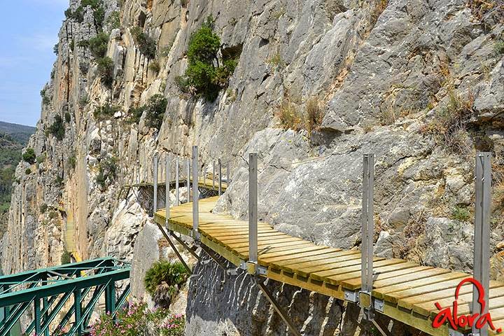 In een kloof van 300 meter diep hangt aan de bijna verticale wanden, zo’n 100 meter boven de Guadalhorce rivier, het 3 Km. lange en 1 meter brede wandelpad El Caminito del Rey (het wandelingetje van de koning).
